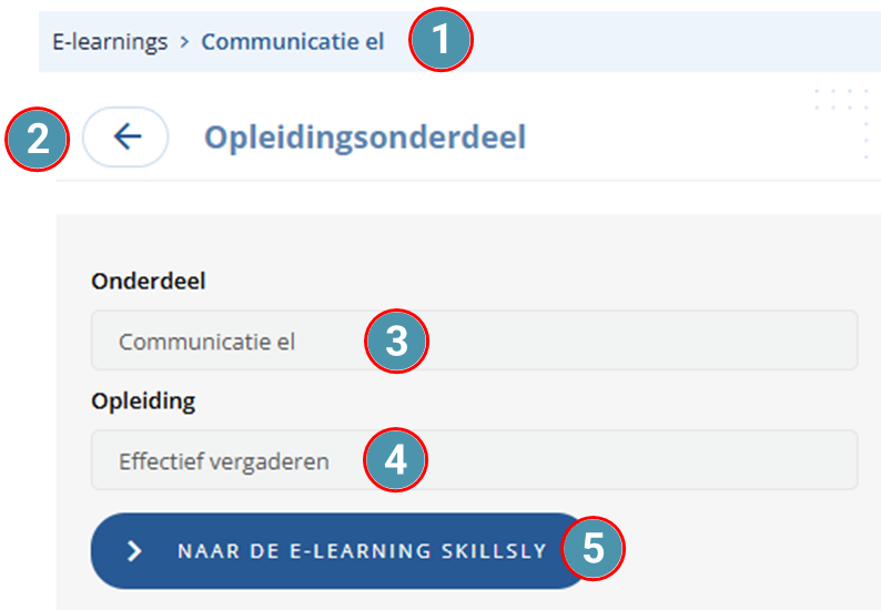 - Les wordt ook wel opleidingsonderdeel genoemd, met het pijltje keer je terug naar de lijst met e-learnings.