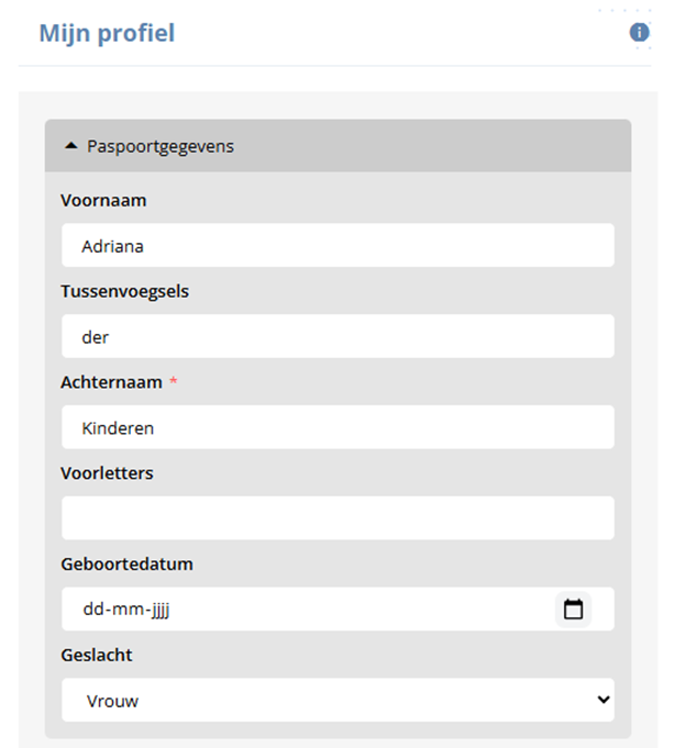 In het scherm zie je de gegevens die bij de opleider bekend zijn. De gegevens zijn verdeeld in drie panels:- Paspoortgegevens.