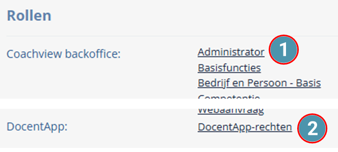 | Daarvoor heb je administrator rechten in Coachview nodig (1) en moet je de gebruikersrol 'DocentApp-rechten' (2) aan jouw gebruikersaccount toevoegen. Daarmee kun je inloggen in de DocentApp. |  |