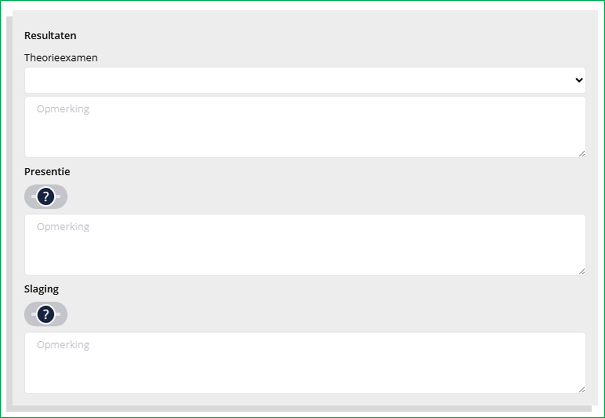 Wordt op de naam van een deelnemer geklikt dan kunnen eventuele resultaten, de presentie en slaging worden ingevuld. Voor alle drie kan een opmerking worden toegevoegd.